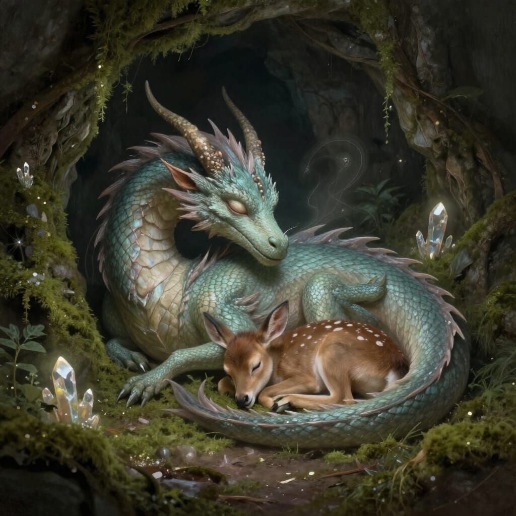 This image depicts a gentle mythical dragon and a sleeping fawn in a mossy cave, bathed in soft, ambient light. The scene evokes a sense of ethereal calm and safety with muted colors and painterly softness.