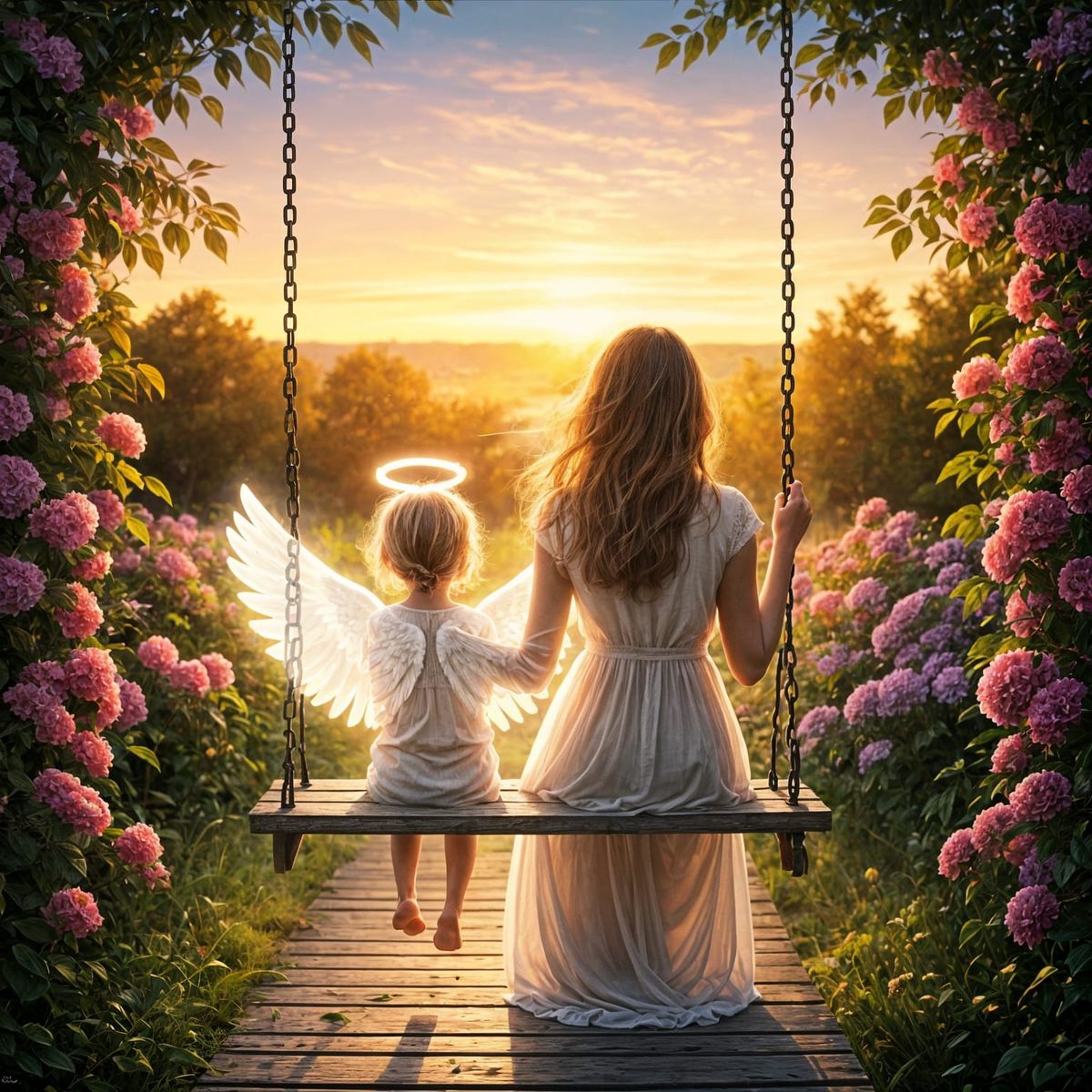 A realistic, emotionally powerful scene showing a woman sitting on a wide wooden swing, viewed from behind. Next to her sits the transparent glowing silhouette of a child with angel wings. They both face a vivid sunset in a beautiful garden. The atmosphere feels peaceful and melancholic. The woman’s ...