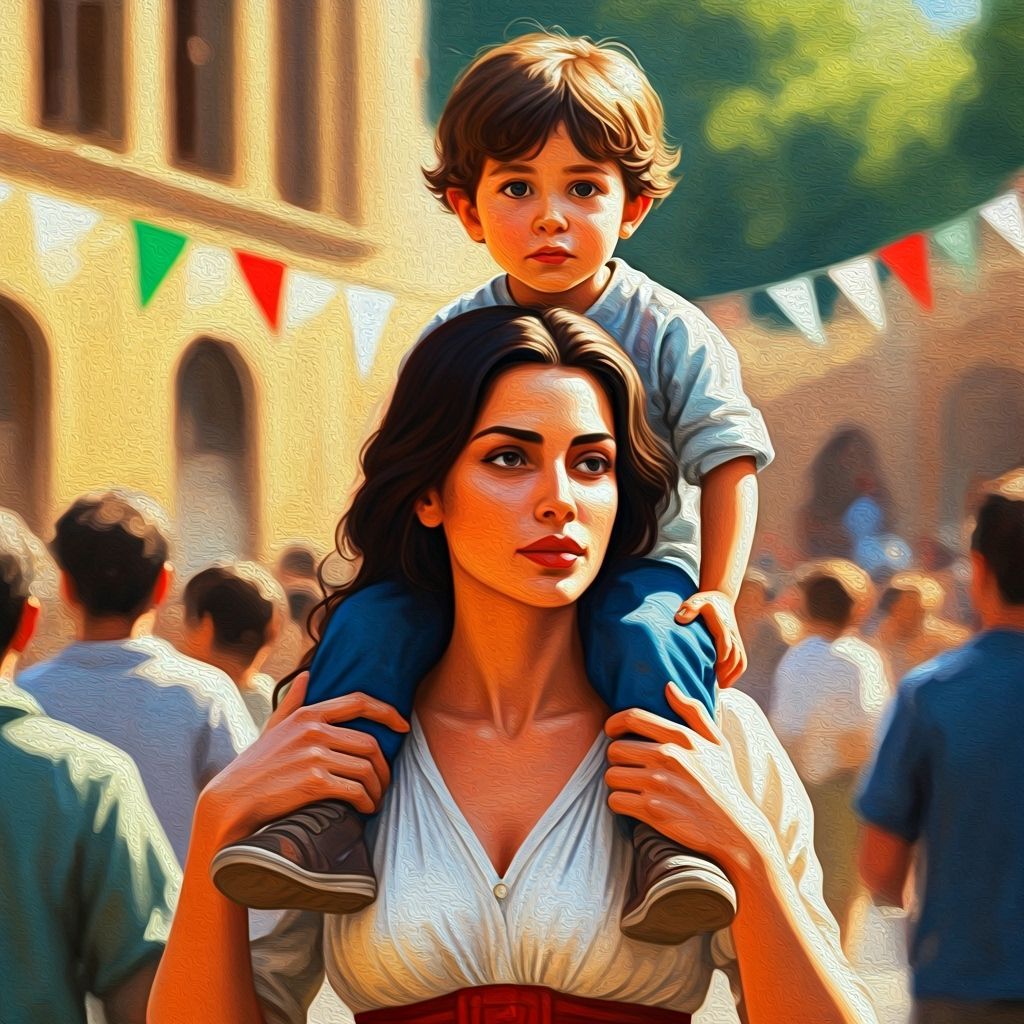 A statuesque Italian woman with long brunette hair carries a boy on her shoulders amidst a lively festival. Rendered in a vivid impressionistic oil painting style with expressive brushstrokes.