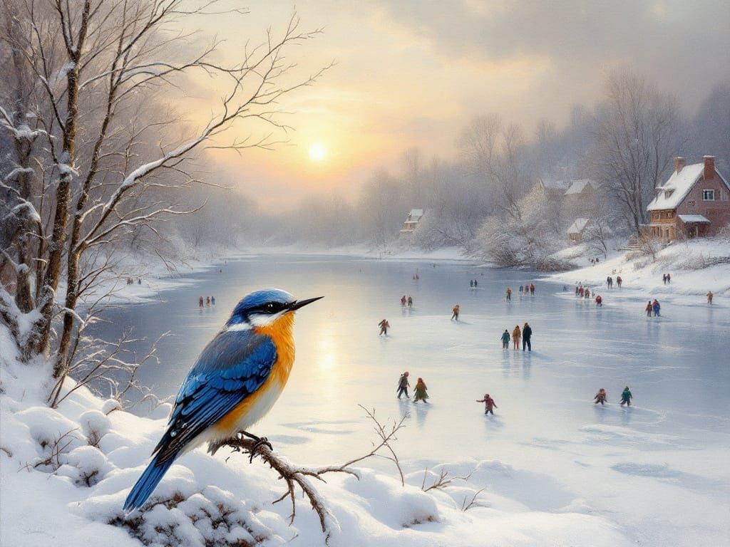 A detailed oil painting of a winter wonderland scene with people ice skating on a frozen lake. A colorful bird sits on a branch in the foreground during a sunset, rendered with fine brushstrokes.