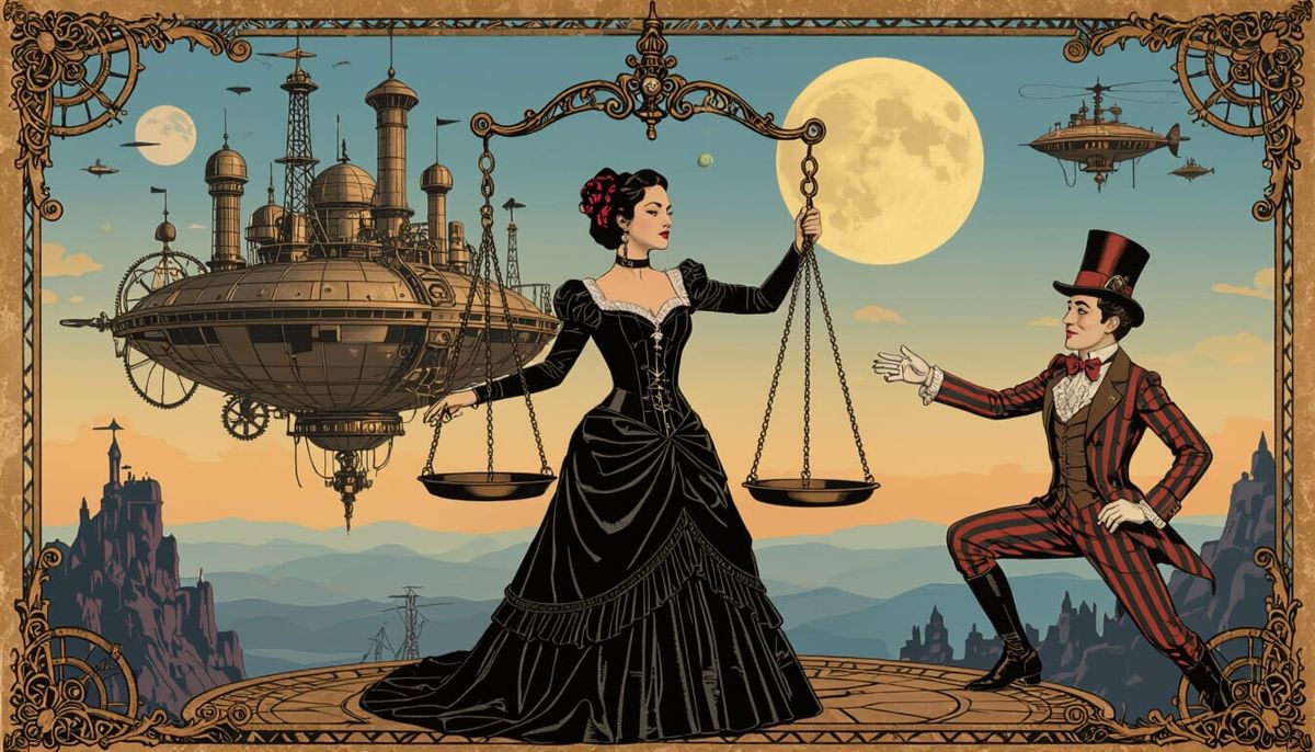 A striking picture of a mysterious woman standing on a justice scale facing a steampunk city. A comical figure watches from a precipice against a golden sunset, in a surreal steampunk style.