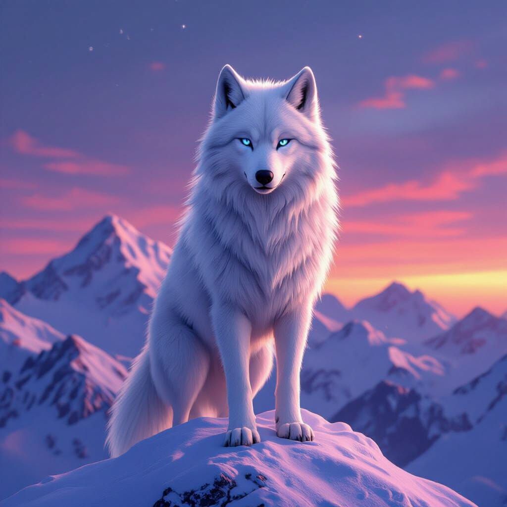 A striking picture of a white wolf standing on a snowy mountain at twilight. This 3D anime-style image features intricate details and vibrant colors, with soft textures and subtle lighting effects.