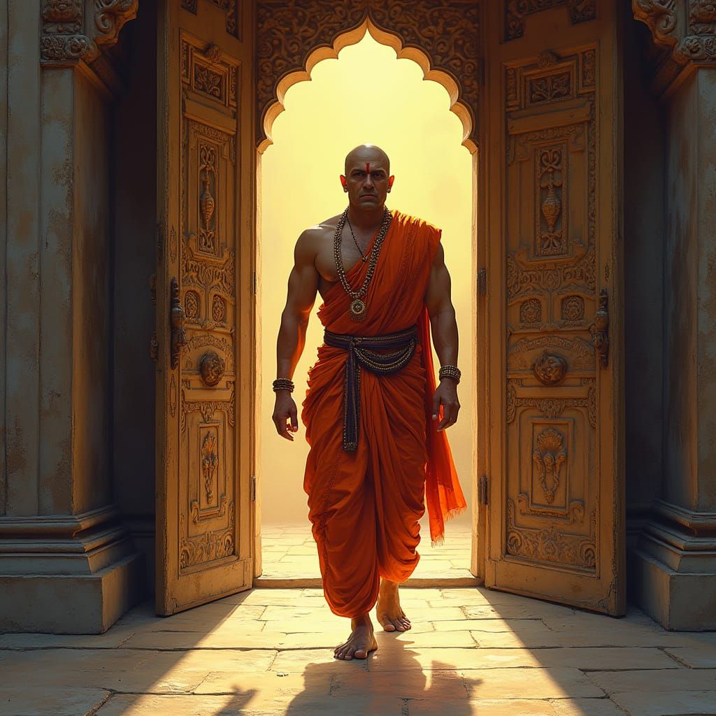 A vivid image of Chanakya in traditional Indian clothing walking through an ornate doorway. The artwork evokes the style of classical Indian painting with dramatic lighting and vibrant colors.