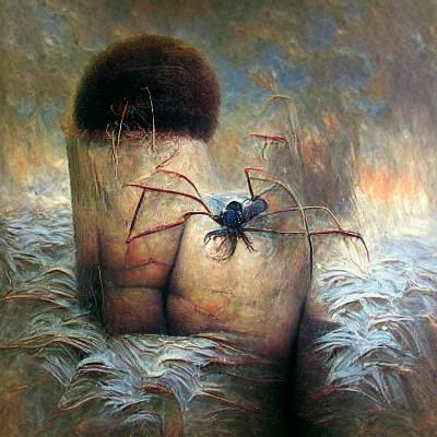 This image depicts a surreal spider-like creature in a nightmarish landscape, rendered with a dark, gothic aesthetic.