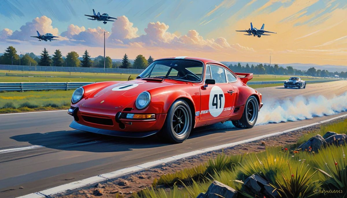 This acrylic painting shows a metallic ruby red 1972 Alpine A110 racing on a course. In the background, F-15 jets take off. The scene features a sunny day and vibrant colors.
