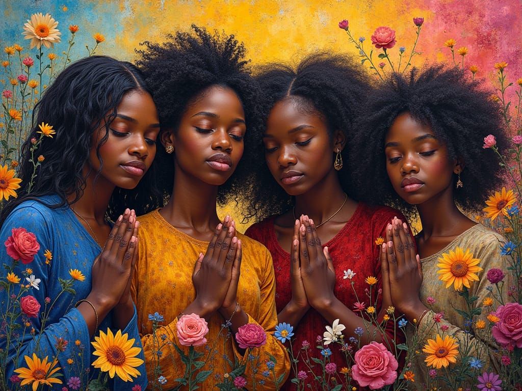 This image shows a serene black family gathered in prayer, surrounded by a kaleidoscope of flowers, in a style that blends neo-impressionism and expressionism, with thick, textured acrylic paint and bold, expressive strokes.