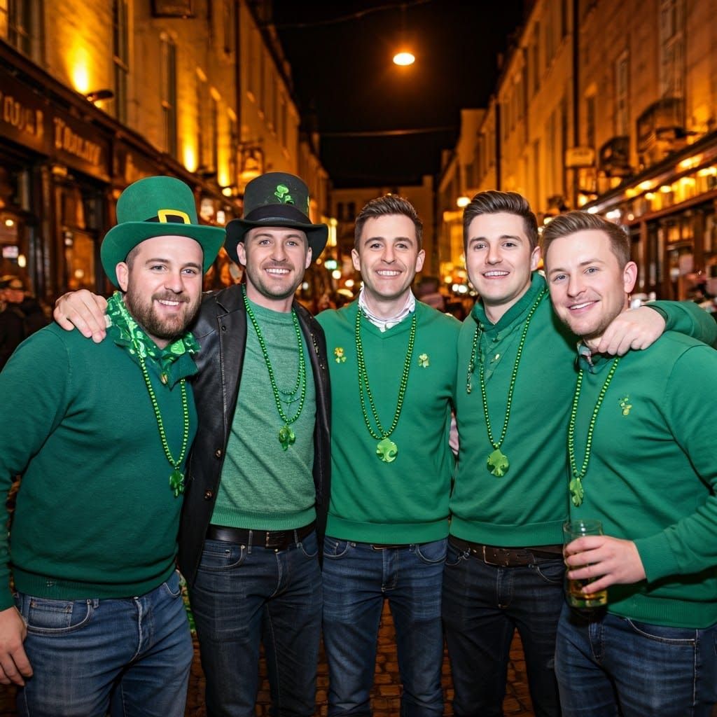 This image captures the infectious energy and camaraderie of a group of men celebrating Saint Patrick's Day in the bustling streets, surrounded by festive decorations and crowded pubs, with a beautiful bokeh effect emphasizing their joyful atmosphere.