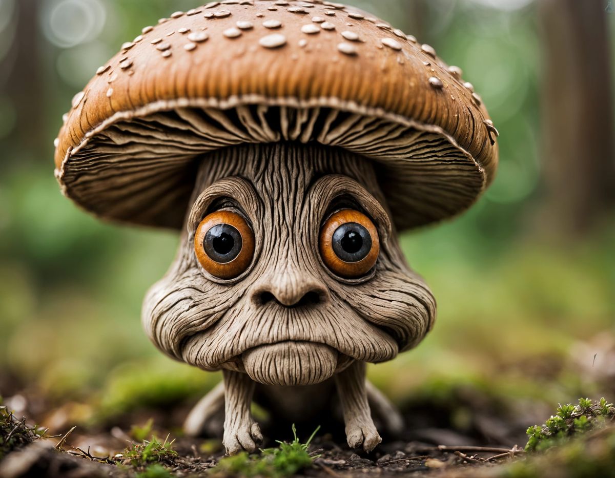 This image shows an extreme close-up of an old, anthropomorphic mushroom character. Professional photography captures sharp focus with natural lighting and a bokeh effect.