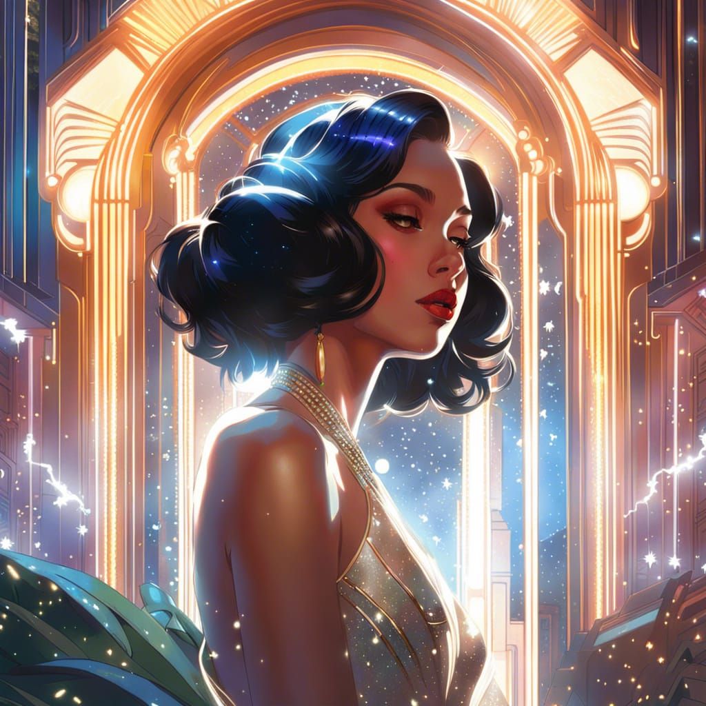 style of guweiz, cory loftis, disney, beautiful fantasy art deco architecture surrounded by glowing sparkles, Insanely detailed hyper-realistic art deco architecture, surrounded by glowing luminescent particles, highly detailed, style of J.C. Leyendecker, ilya Kuvshinov
