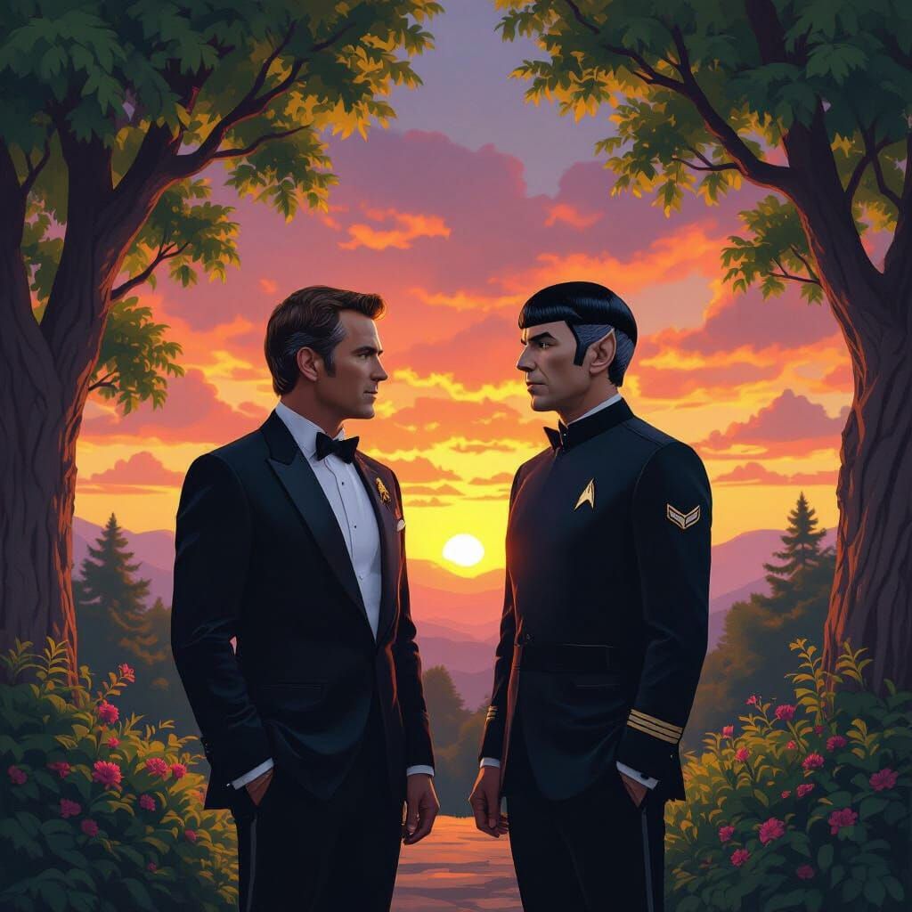 A cinematic matte painting shows Captain Kirk and Spock at a wedding ceremony, set against lush trees and a fiery orange and purple sunset. The scene captures a moment of farewell and new beginnings.