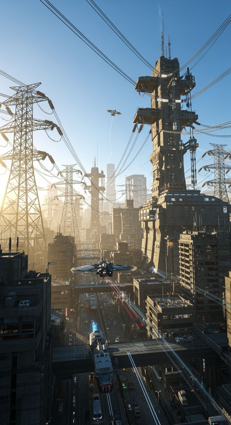 A vibrant cityscape at dawn showcasing complex energy systems. The image shows towering transmission lines and power pylons dominating the skyline, with glowing energy conduits in a technologically advanced, slightly dystopian world.