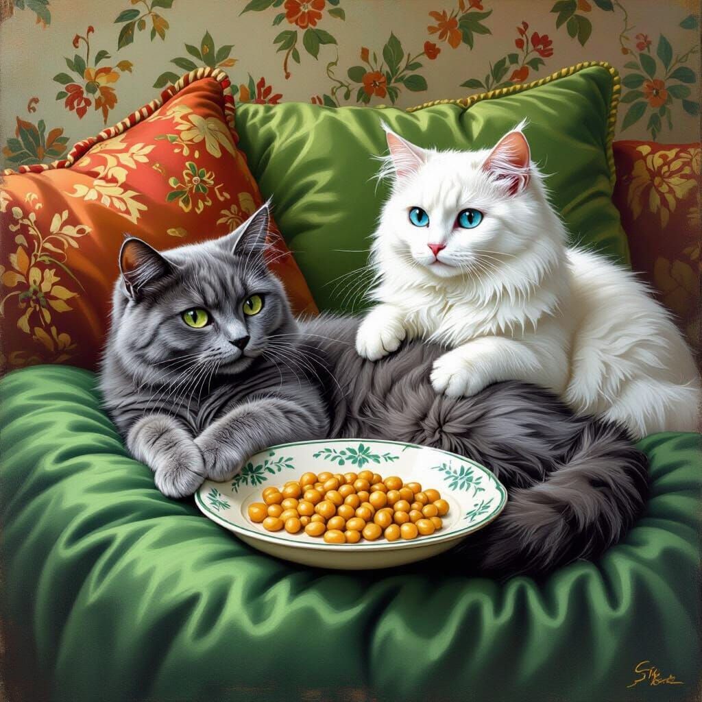 This image shows a relaxed grey tabby cat on a green velvet stretcher, being fed by a white cat with blue eyes. It features detailed textures and realism.