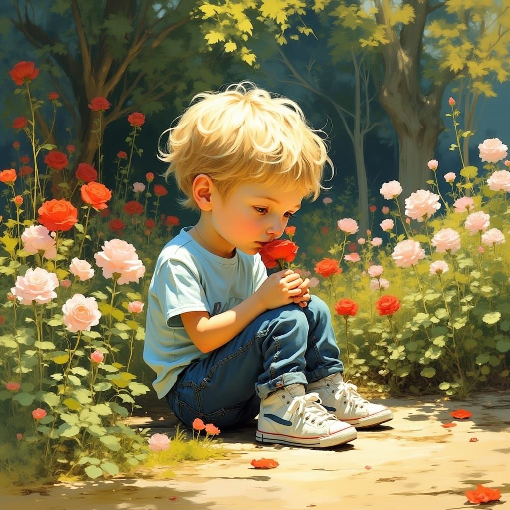 A little boy in a garden smelling a beautiful flower.