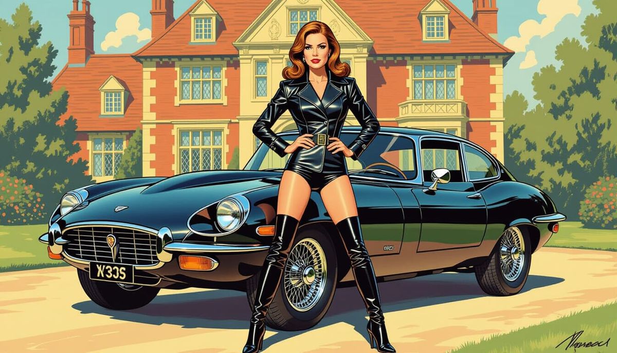 This image shows Emma Peel as a British spy in a black leather jacket and boots, posed with a 1966 Jaguar XKE against an English manor, illustrated in a vintage pulp style.