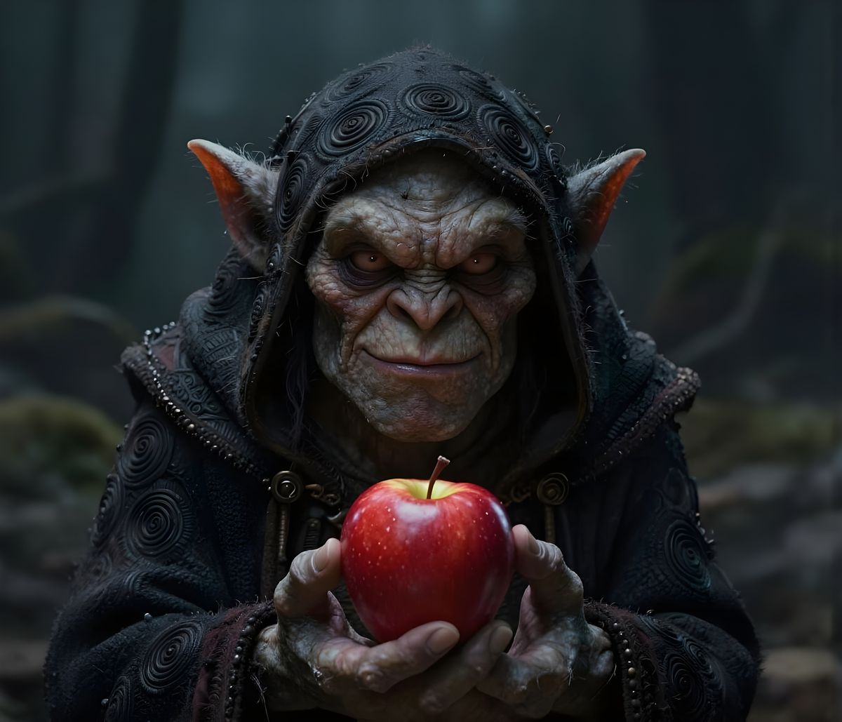 This 3D rendered image features a smug troll in a cloak, holding a red apple. The closeup shot emphasizes dark tones and intricate spiral patterns, creating a silent and grim atmosphere.
