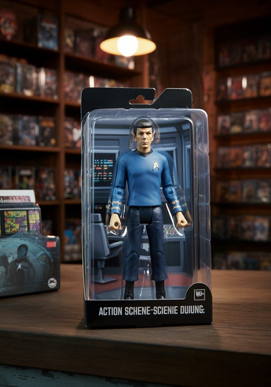 This image shows a detailed figurine of Spock in his blue science uniform, posed in a plastic blister box within a meticulously crafted USS Enterprise bridge diorama, set in a nostalgic game shop with retro-futuristic flair.