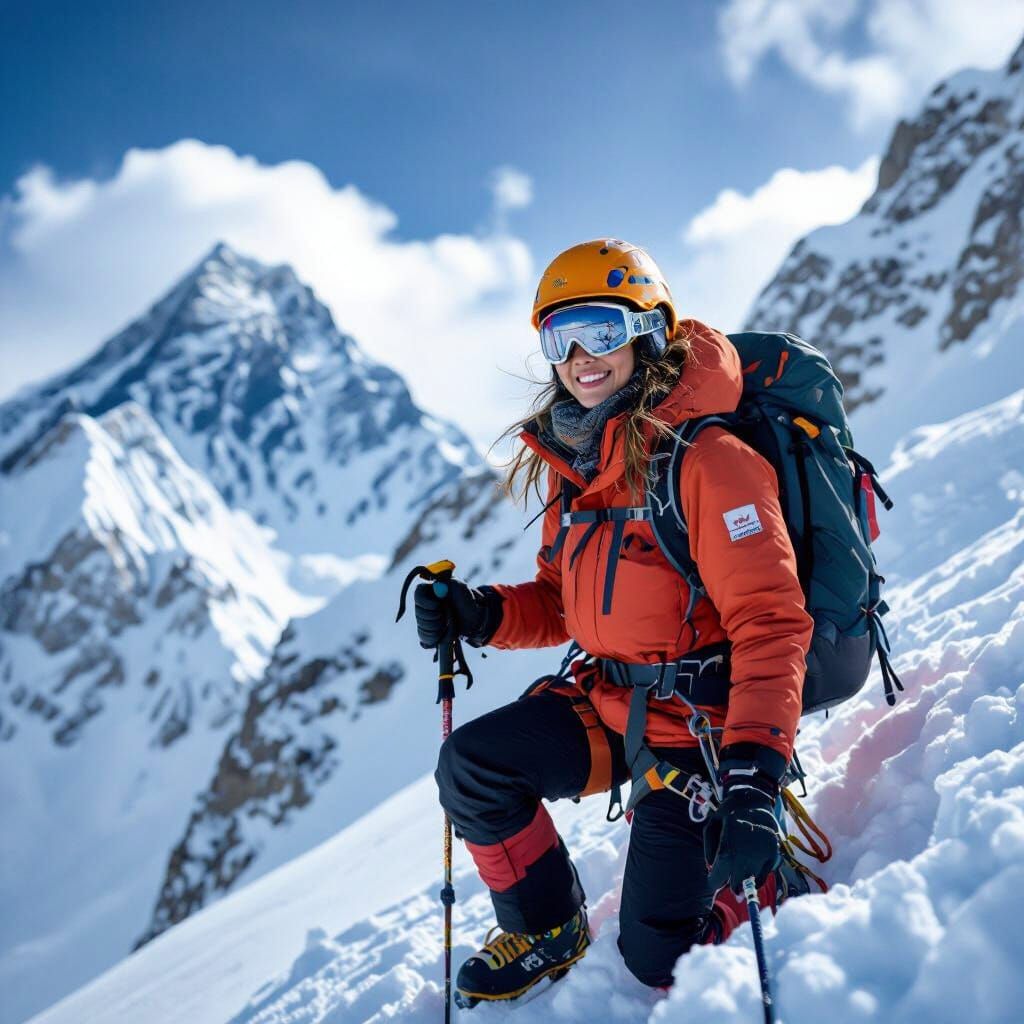 This image depicts a determined woman scaling Mount Everest in 2025. Clad in climbing gear, she pushes toward the summit through severe weather conditions, as a digital render.
