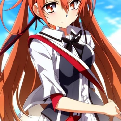 This image shows an anime-style girl with red twintails, wearing a school uniform and smiling. She has clear skin and green eyes, rendered in a key visual style reminiscent of Japanese manga.