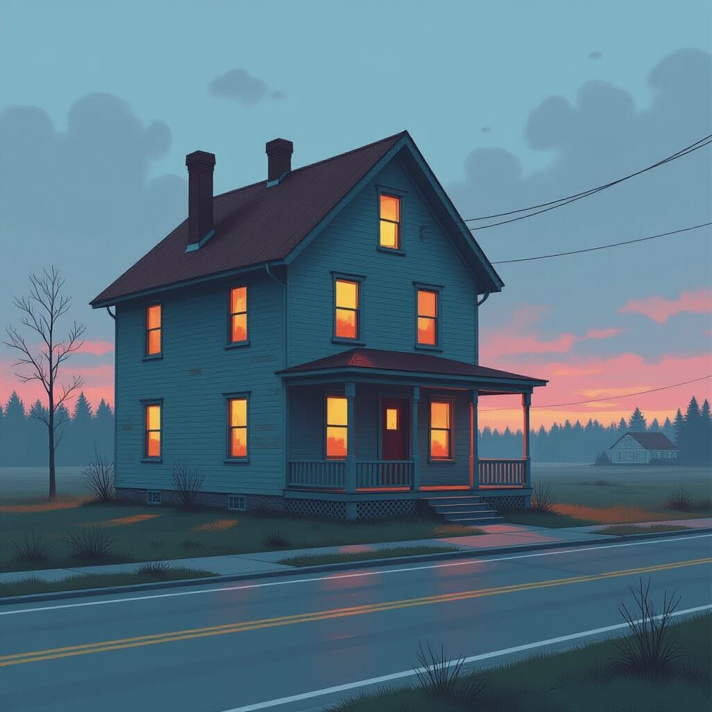 This image depicts a desolate, abandoned flop house in a stark, atmospheric landscape, rendered in a style reminiscent of Simon Stålenhag's work.
