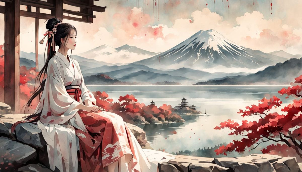 This image shows a dreamy Japanese woman in a serene landscape. The artwork evokes traditional Japanese art with ink and watercolor techniques, featuring a vintage feel and grungy texture.