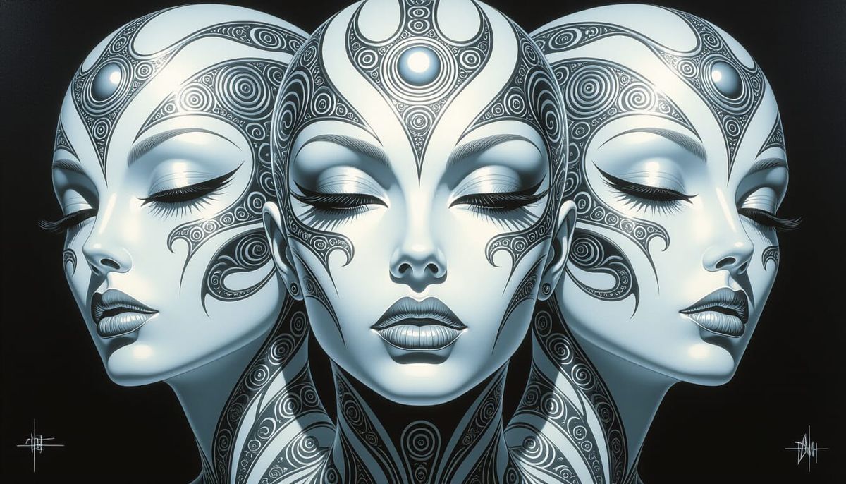 This image shows surrealist science fiction art featuring white, silver alien faces with exotic tattoos and strange alphabets. The artwork is highly detailed and rendered in bright daylight.