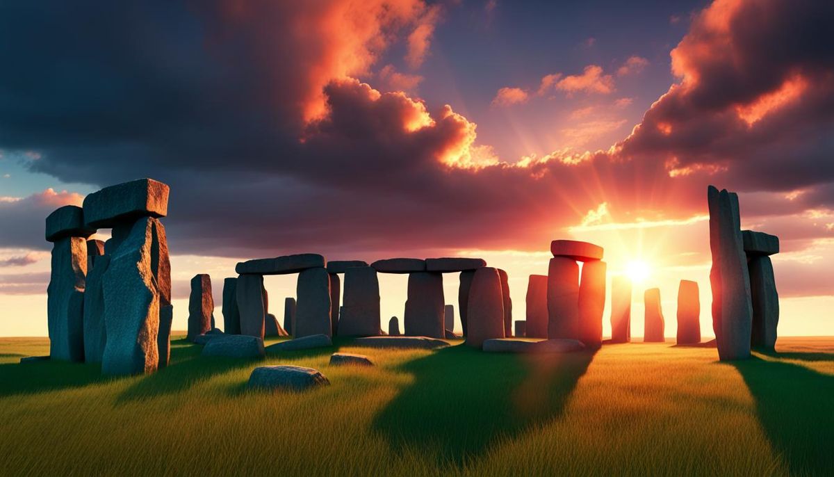 This image shows Stonehenge at twilight after a storm. The sky is a mix of blue and red, with light rays piercing through the clouds above the hilly green landscape in this photorealistic rendering.