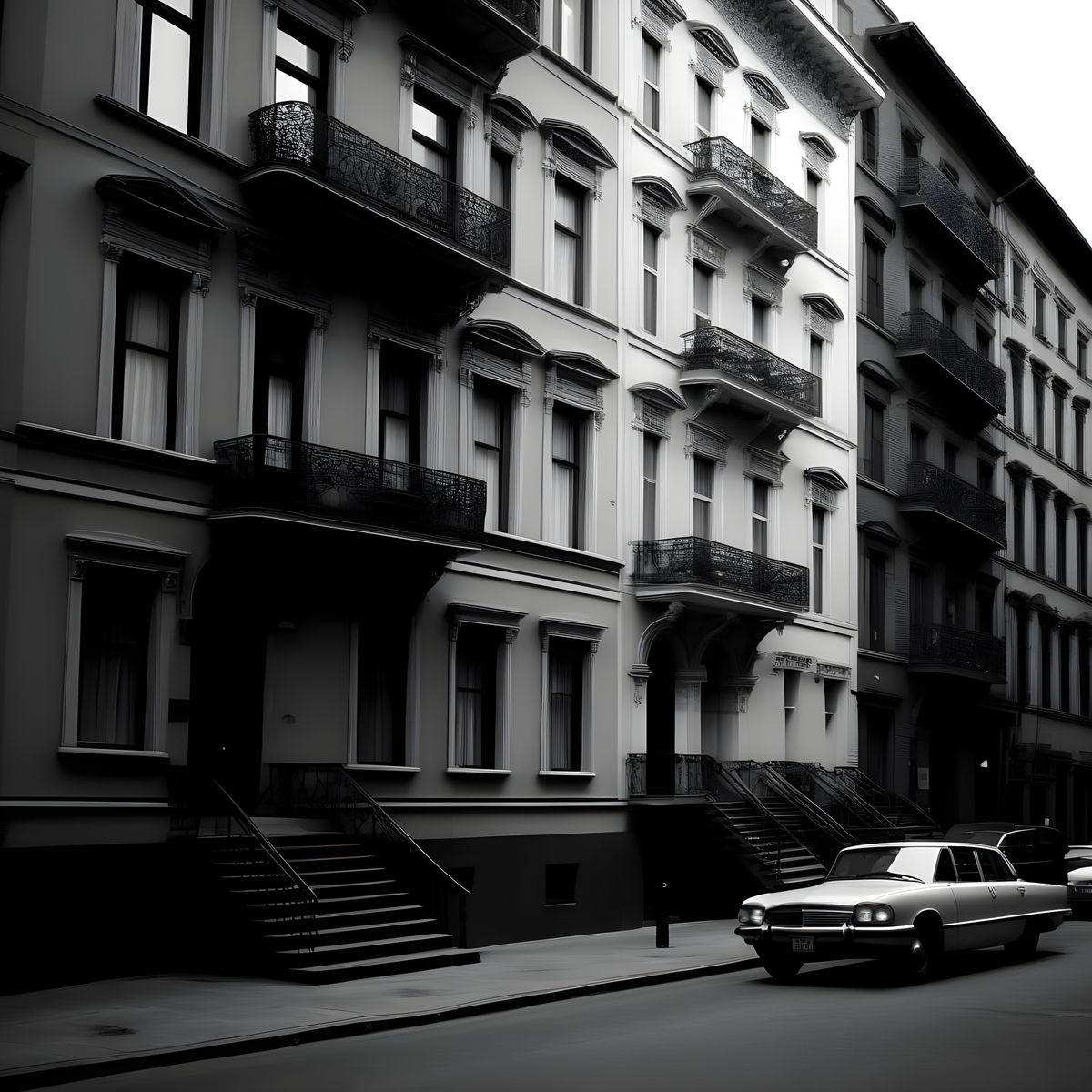 A serene black and white urban street scene at night, featuring ornate residential buildings, classic cars, and a winding staircase, creating a sense of stillness and quiet calm.