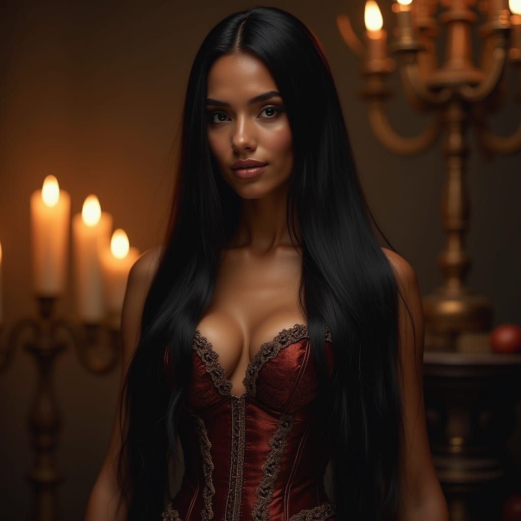 This image features a stunning mixed-race woman in a 17th-century musketeer setting, adorned in an intricately designed corset, with long straight black hair cascading down her back, set against a warm candlelit backdrop with ornate details.