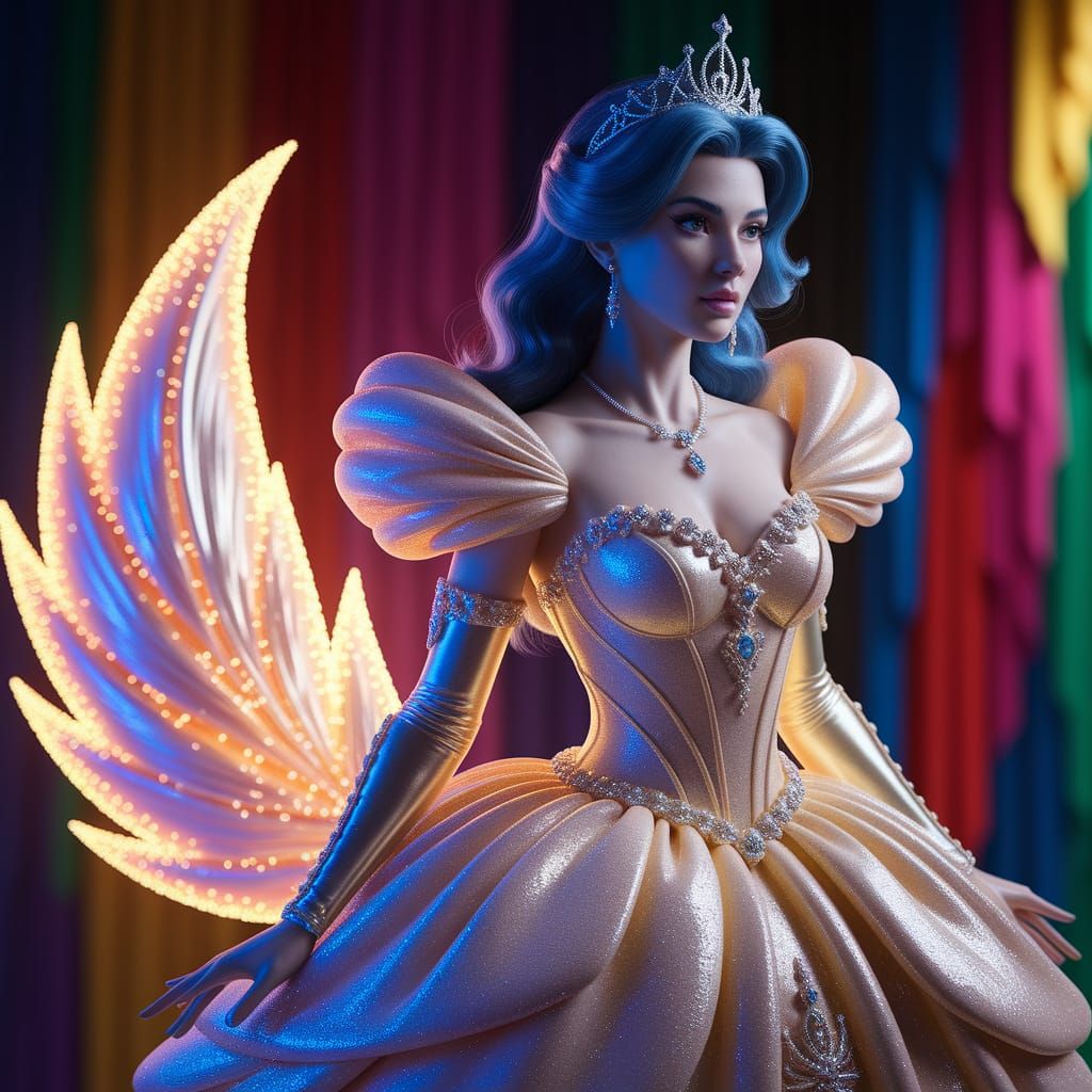 This image shows a stunning princess in a gala-style outfit with a glowing golden dress and a vibrant tail, set against a colorful background in a dramatic, hyper-realistic scene.