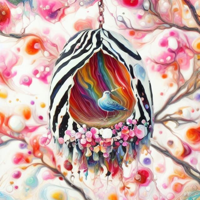 This impressionist oil painting depicts an oversized zebra-striped Easter egg birdhouse nestled in a blooming sakura tree, bathed in soft spring light. Features a delicate striped bird and intricate parchment textures.