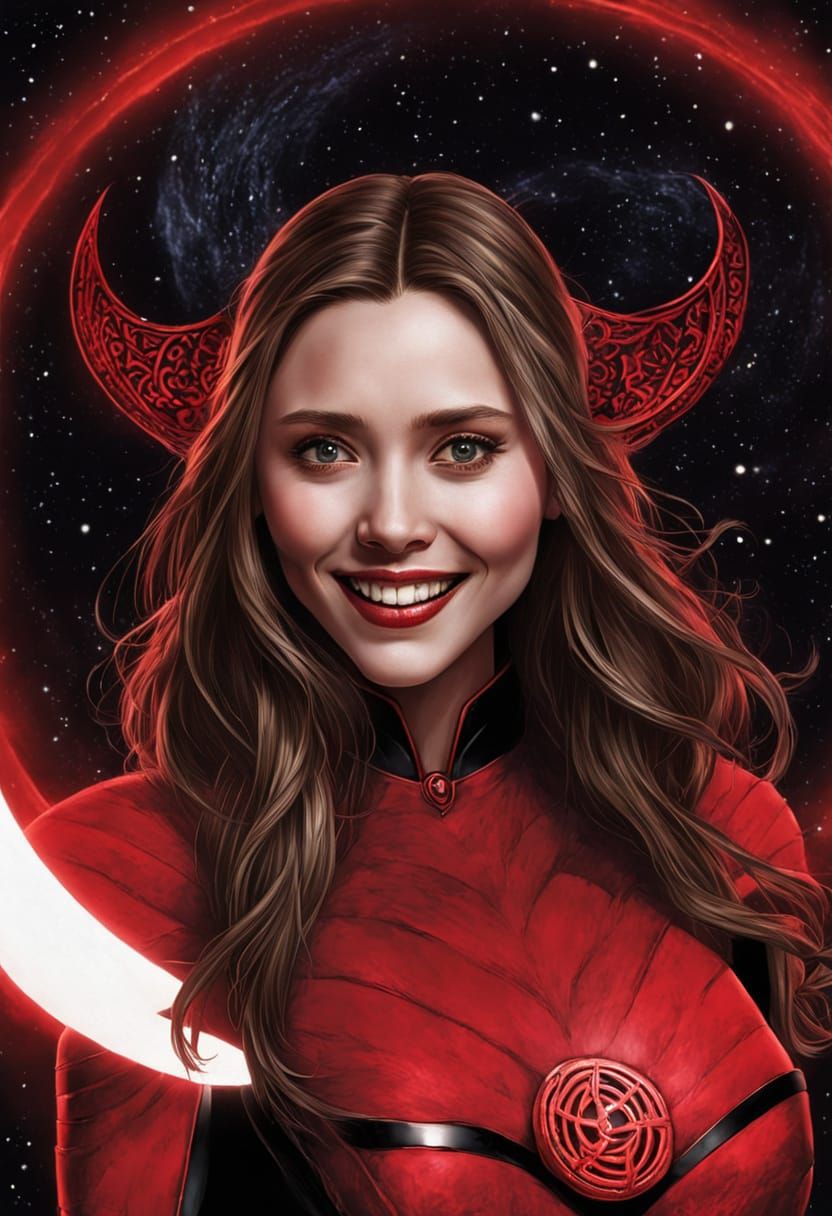 This image shows Elizabeth Olsen as a Red Lantern character with a sadistic expression in a space setting. She is wearing a black and red Red Lantern outfit.