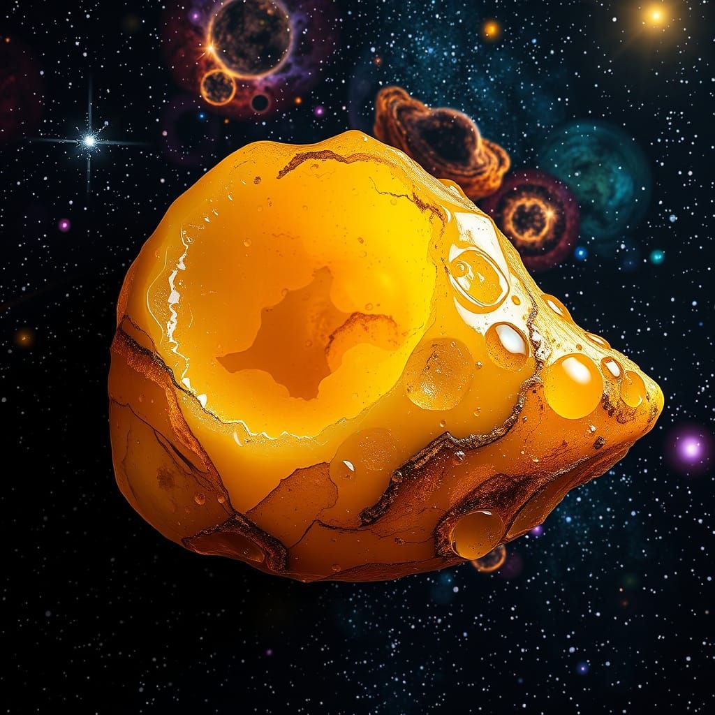 This image shows a stunning depiction of a giant spaceship shaped like lemons, soaring through a vibrant saffron-colored space landscape filled with stars, planets, and a sunburst, set amidst a backdrop of black holes and multidimensional galaxies.