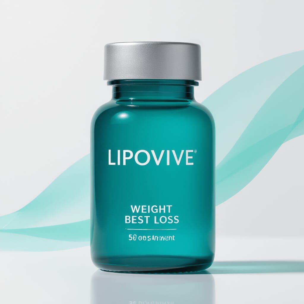 A sleek, modern product photo of a vibrant teal Lipovive weight loss supplement bottle on a clean white background, featuring subtle lighting and a soft blue-green gradient. Professional and aspirational aesthetic.