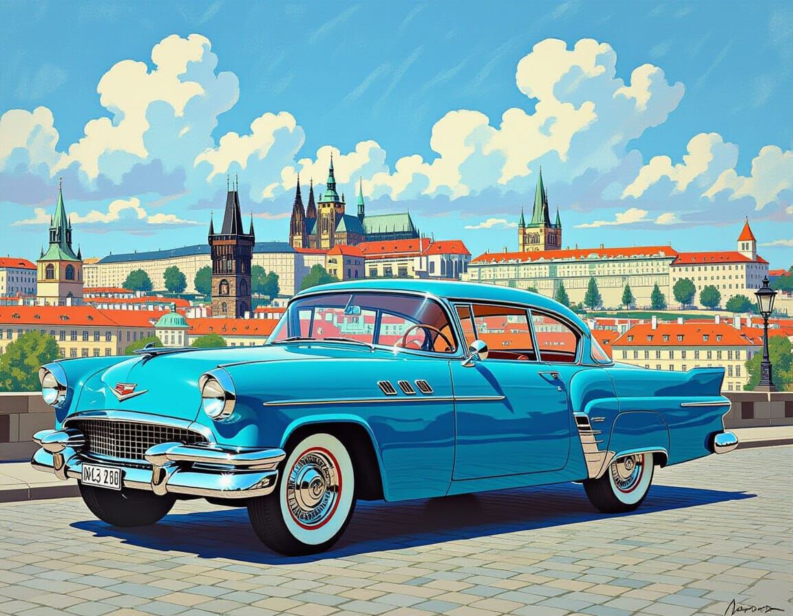 A vintage Tatra 603 muscle car cruises against the Prague skyline. This striking image blends Art Nouveau aesthetics with gouache and watercolor textures, reminiscent of thick impasto brush strokes.