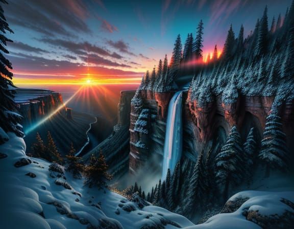 This image captures a mystical waterfall cascading into a snow-covered canyon, framed by pine trees and a vibrant sunset. Ethereal art style with cool blues and warm sunset hues.
