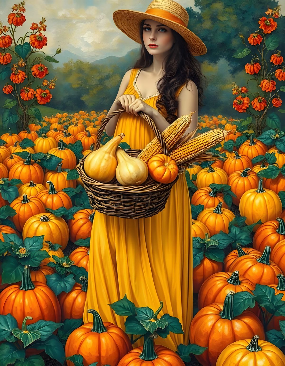 This image shows a richly textured oil painting of a woman in a yellow dress holding a basket of gourds and corn amidst a pumpkin field. It features vivid colors and flowing lines in an Art Nouveau style.