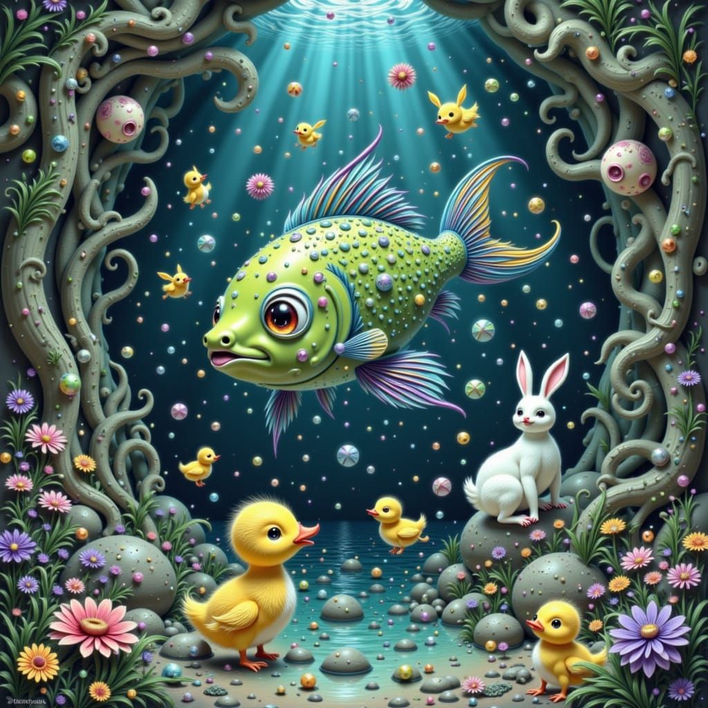 A whimsical illustration of a fish disguised as a sea monster in a cove. Ducklings, frogs, and bunnies surround it in this storybook-style scene with intricate details and textures.