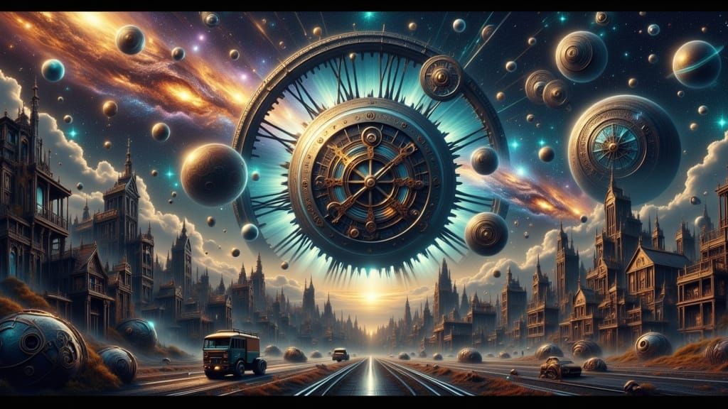 A hyperrealistic double exposure of a vast, cog-shaped world at the center of a cosmic clock face universe. Features nebulae, stars, and steampunk elements with intricate metallic detail.