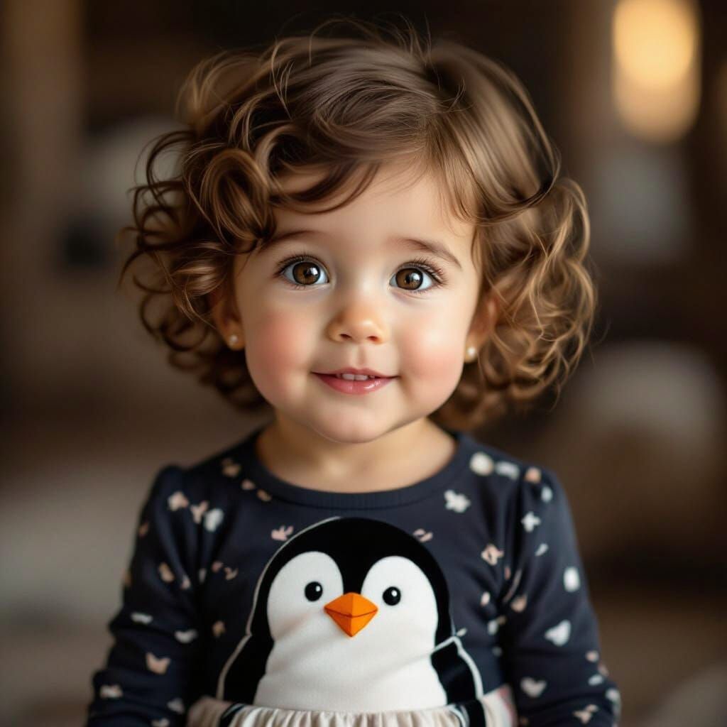 This photorealistic image captures a charming one-year-old girl with short, curly light brown hair and big brown eyes. She wears a cute dress featuring a penguin, and her sweet smile is emphasized by cinematic lighting and a shallow depth of field.