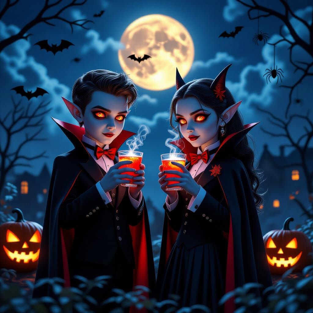 A hyper-realistic photo of teenage vampires with pale skin, fangs, and glowing eyes. Dressed in suits and capes, they hold drinks under a full moon with bats and spiders.