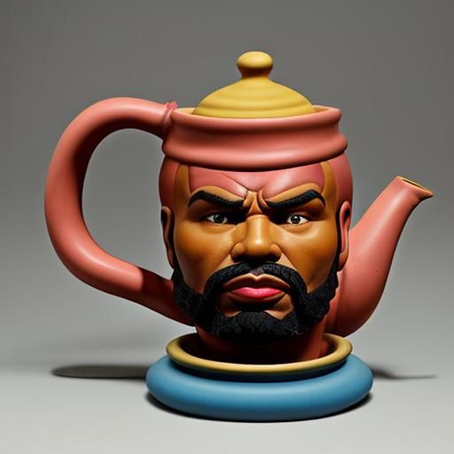 This image shows a novelty teapot shaped like Mr. T's head. The teapot is made of enameled clay and features the iconic hairstyle and facial features of the actor.