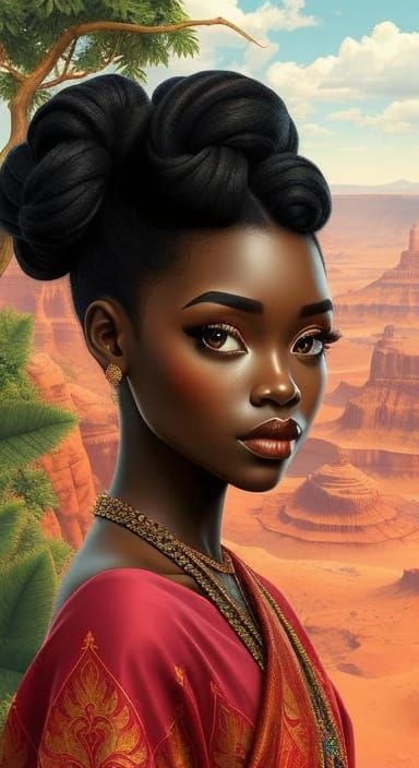 This image shows a Black girl in traditional clothing, standing in a landscape of rainforest and desert. The artwork has a photorealistic, 3D rendered look with vibrant colors and rich textures.