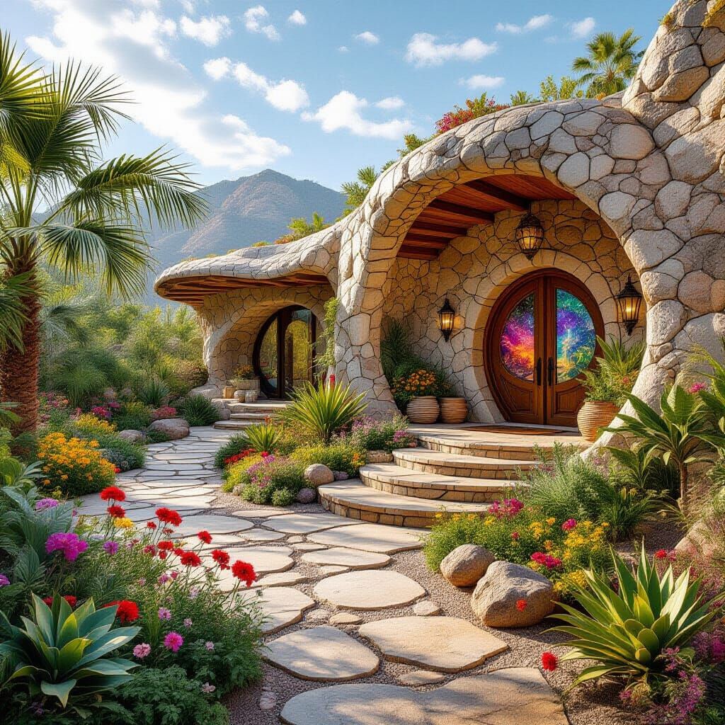 A vibrant desert garden flows into an underground house made of stone and wood. The image blends realism with surrealism, creating a cosmic psychedelic scene with mixed media textures.