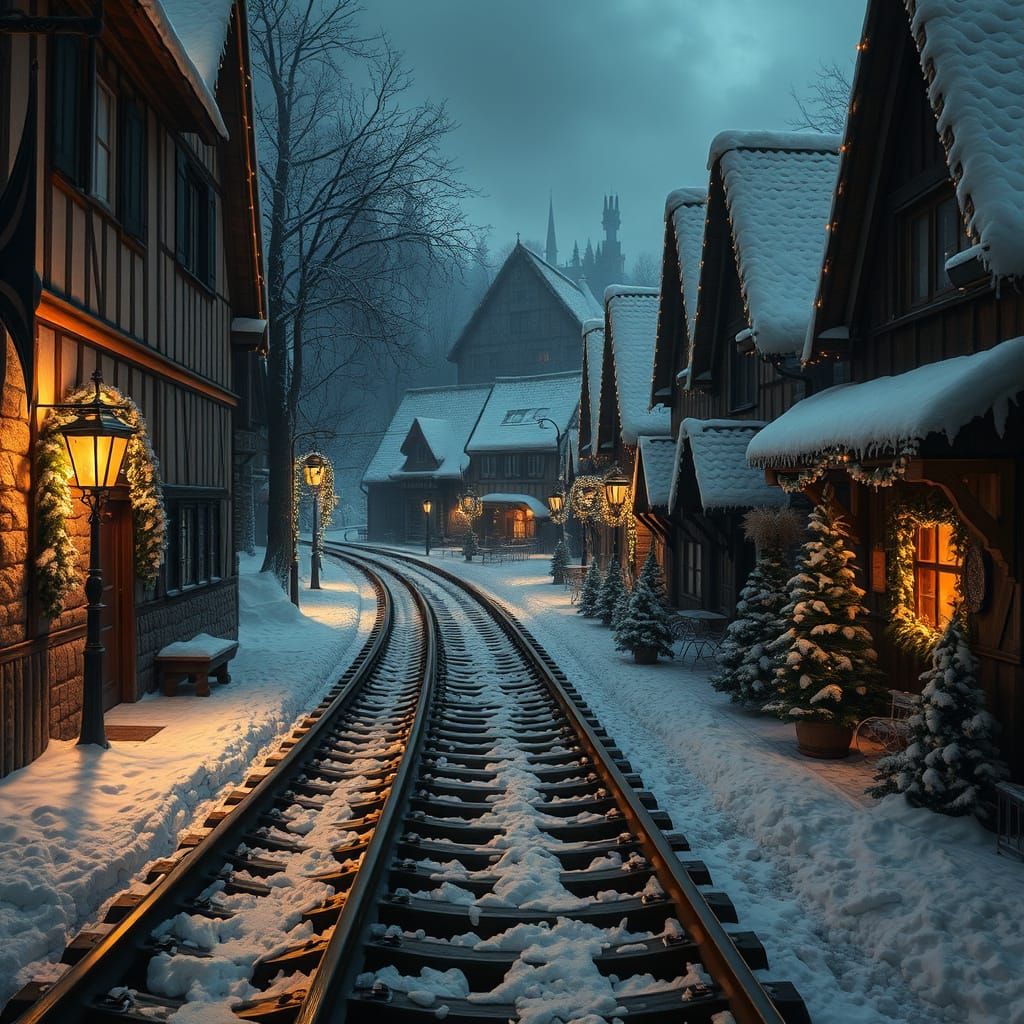 This image depicts a medieval Christmas scene on an ice skating rink, adorned with pine garlands and candy canes. The artwork is a detailed digital matte painting with a dramatic and atmospheric feel.