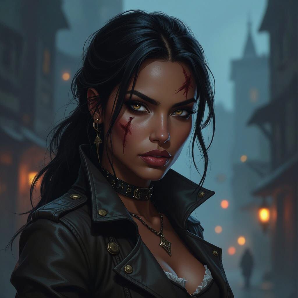 This image shows a female human thief with a scar, no makeup, and a scary look in a dark D&D city. Rendered with dramatic lighting and a muted palette, it has a gritty, realistic digital painting style.