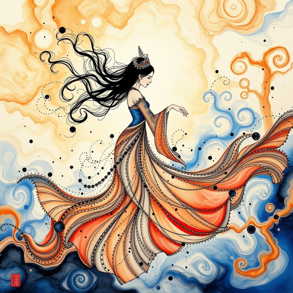 This image showcases a vibrant, ethereal dance within a psychedelic fractal universe. It blends Japanese ink wash, Aboriginal dot art, and fluid silk painting techniques for a dreamy, mystical atmosphere.