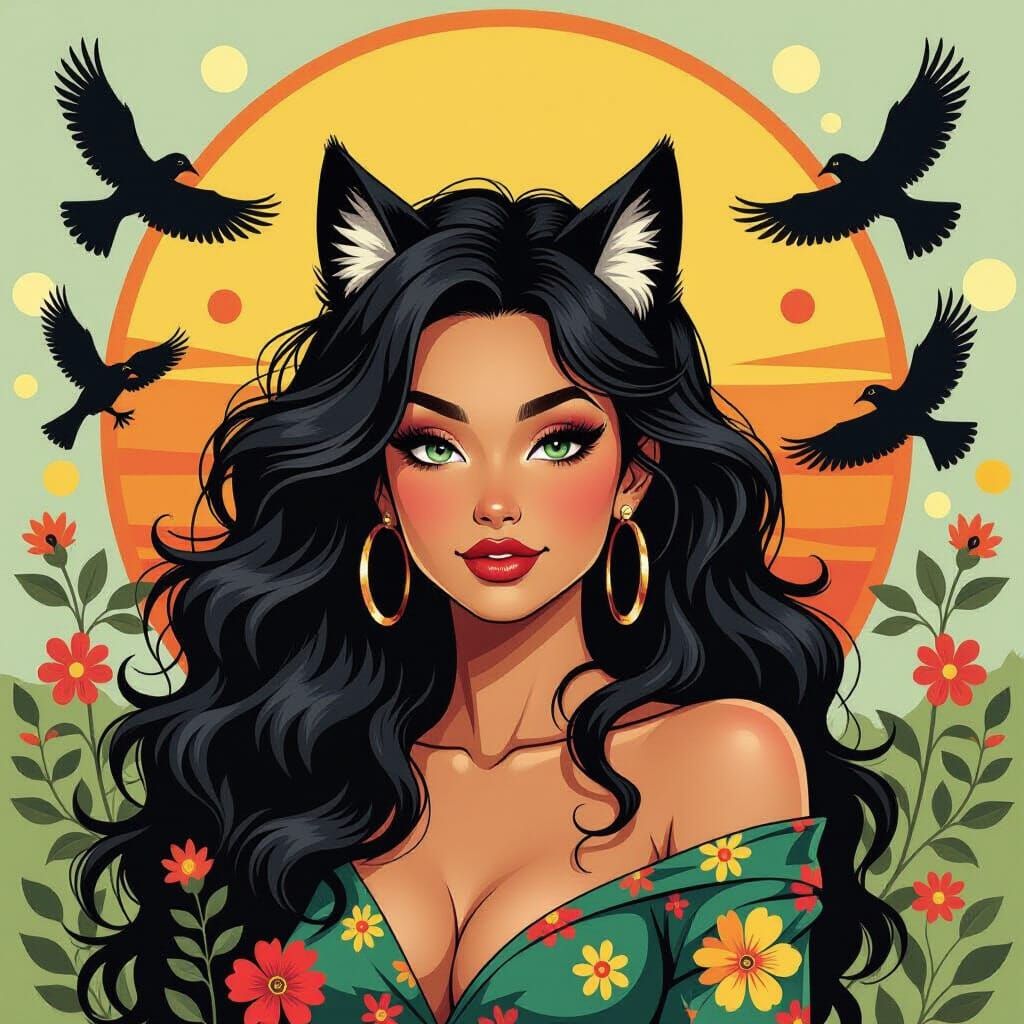 A vibrant image of a powerful animal-woman hybrid, exuding confidence and primal energy. The artwork blends fantasy and realism with vivid colors and detailed textures in a surrealist style.