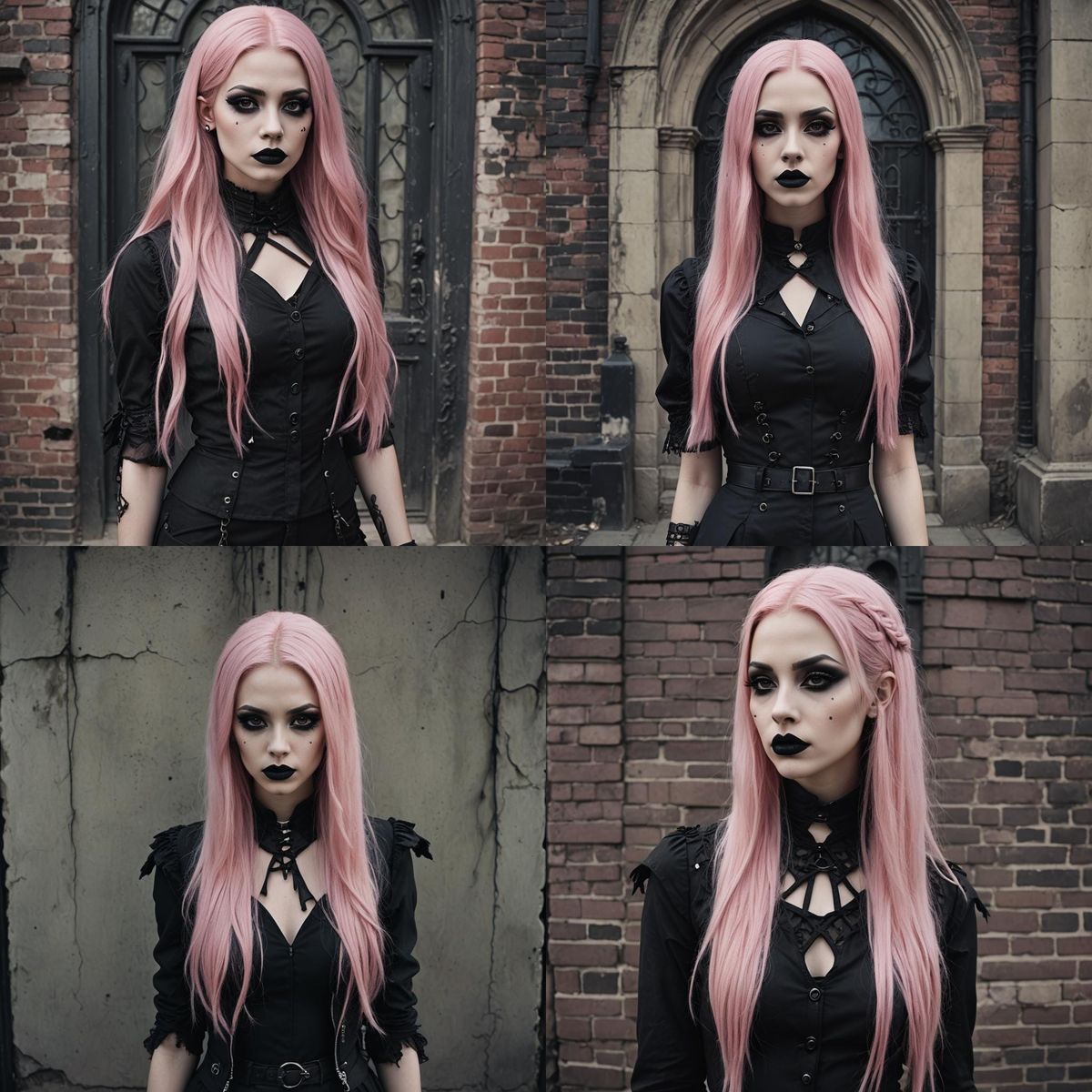 This image shows a gothic-style woman with pink hair and dark makeup. She is wearing black nu goth clothing and high heels, captured with cinematic lighting and film grain.