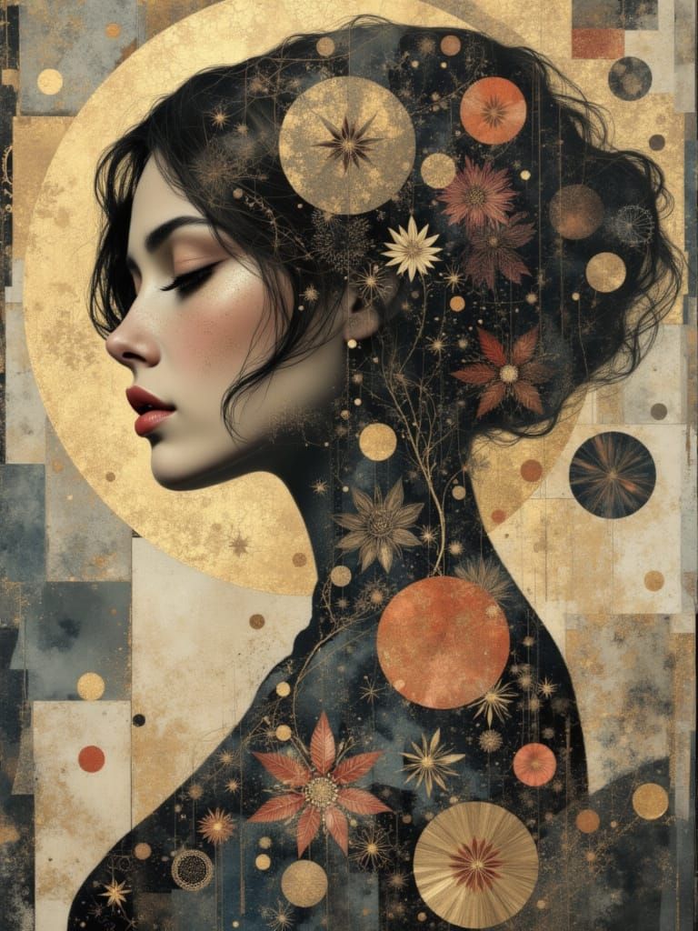 This image shows a mosaic goddess portrait with cubist effects. The artwork creatively blends barcode realism with modern, fragmented forms.