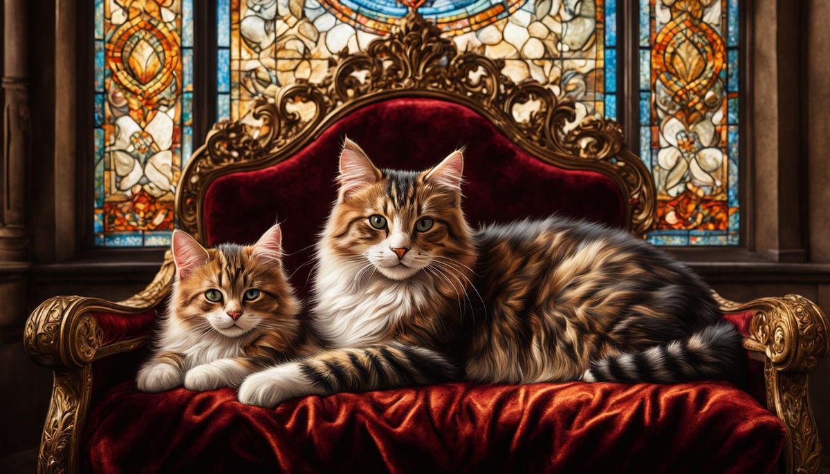 This image showcases a stunning, hyper-realistic portrait of a cat mom and her kittens in a cozy, baroque-inspired setting, bathed in warm golden light and surrounded by intricate patterns.